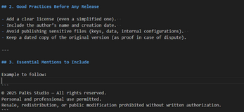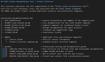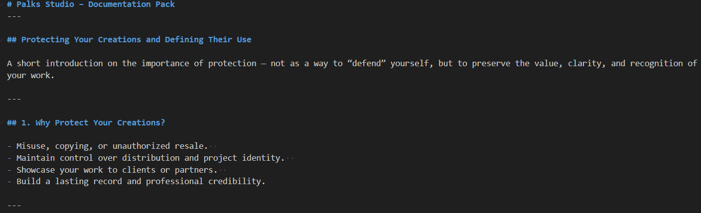 A complete documentation framework designed by Palks Studio for developers and creators who want to structure, present, and protect their projects clearly and consistently.