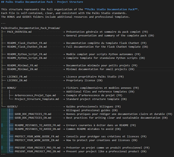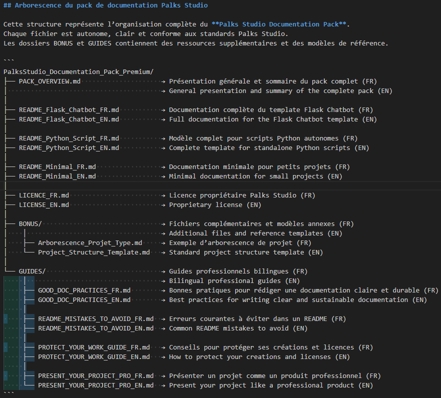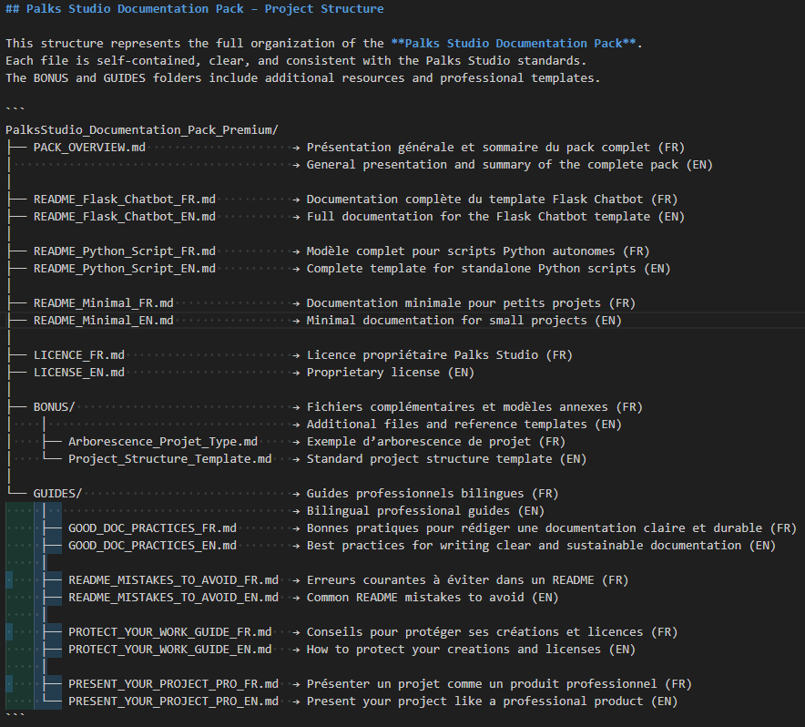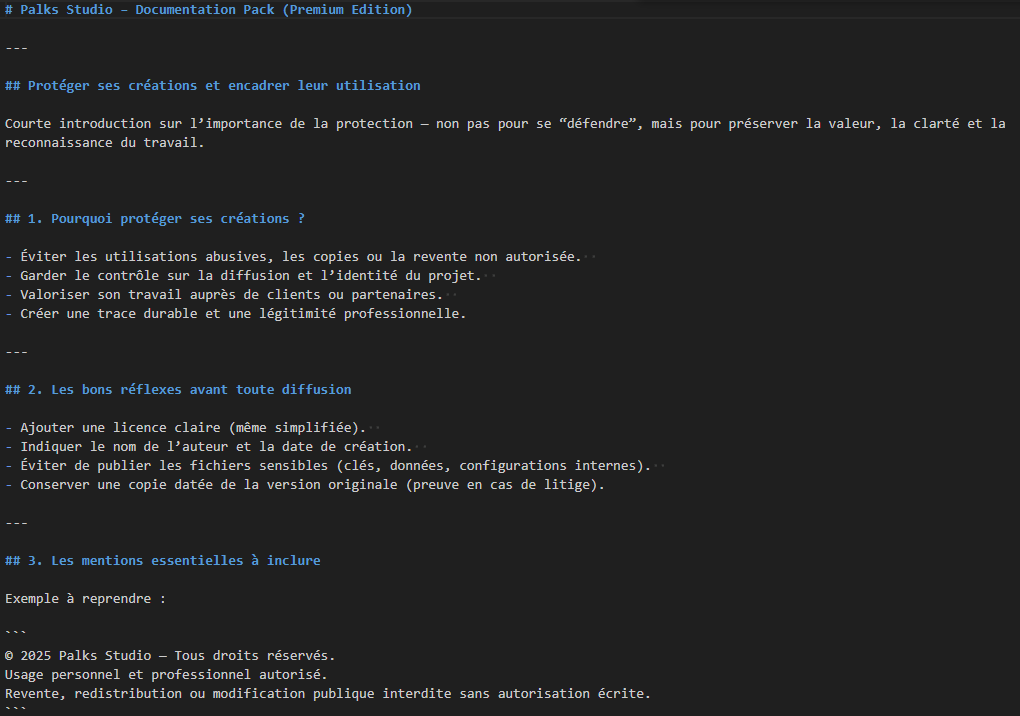 Un pack documentaire complet conçu par Palks Studio pour les développeurs, créateurs et studios souhaitant structurer, présenter et protéger leurs projets avec clarté et cohérence.