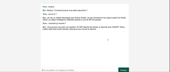 Fonctionne en local (sans clé API) ou connecté à OpenAI (GPT).