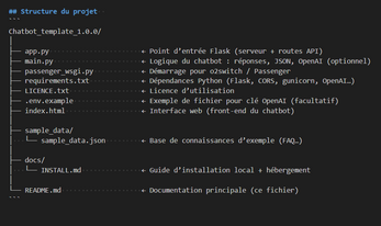 app.py— serveur Flask avec route/chatprête à l’usagemain.py— logique de réponse (JSON local + option OpenAI)sample_data/sample_data.json— base de connaissances neutre et modifiablepassenger_wsgi.py— fichier de déploiement pour o2switch / Passengerrequirements.txt— dépendances Python (Flask, Flask-CORS, Gunicorn…)README.md— installation rapide et structure du projetdocs/INSTALL.md— installation locale + hébergement mutualiséLICENCE.txt— licence d’utilisation professionnelle.env.example— clé OpenAI à personnaliser (optionnel)- Génération automatique du dossier